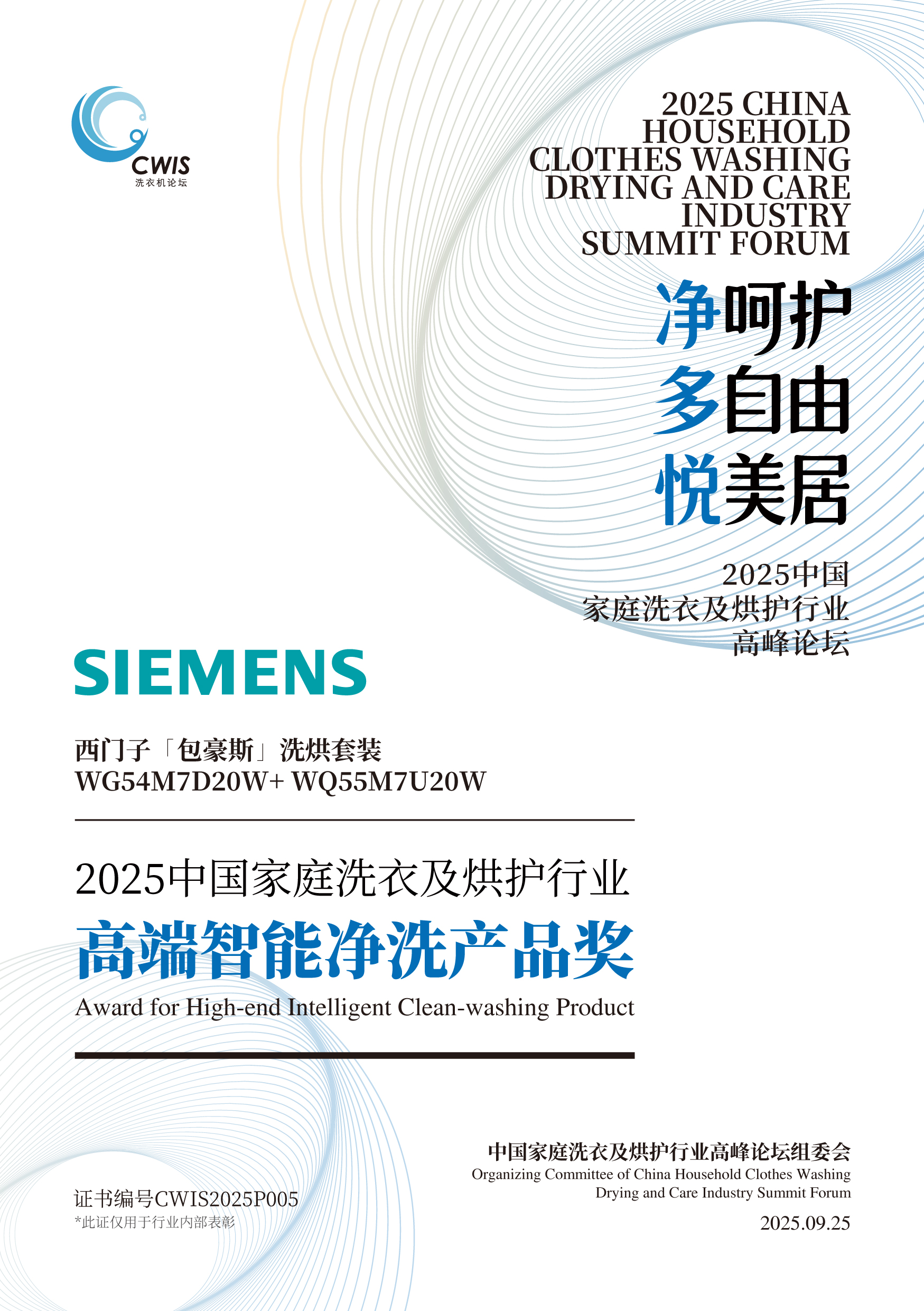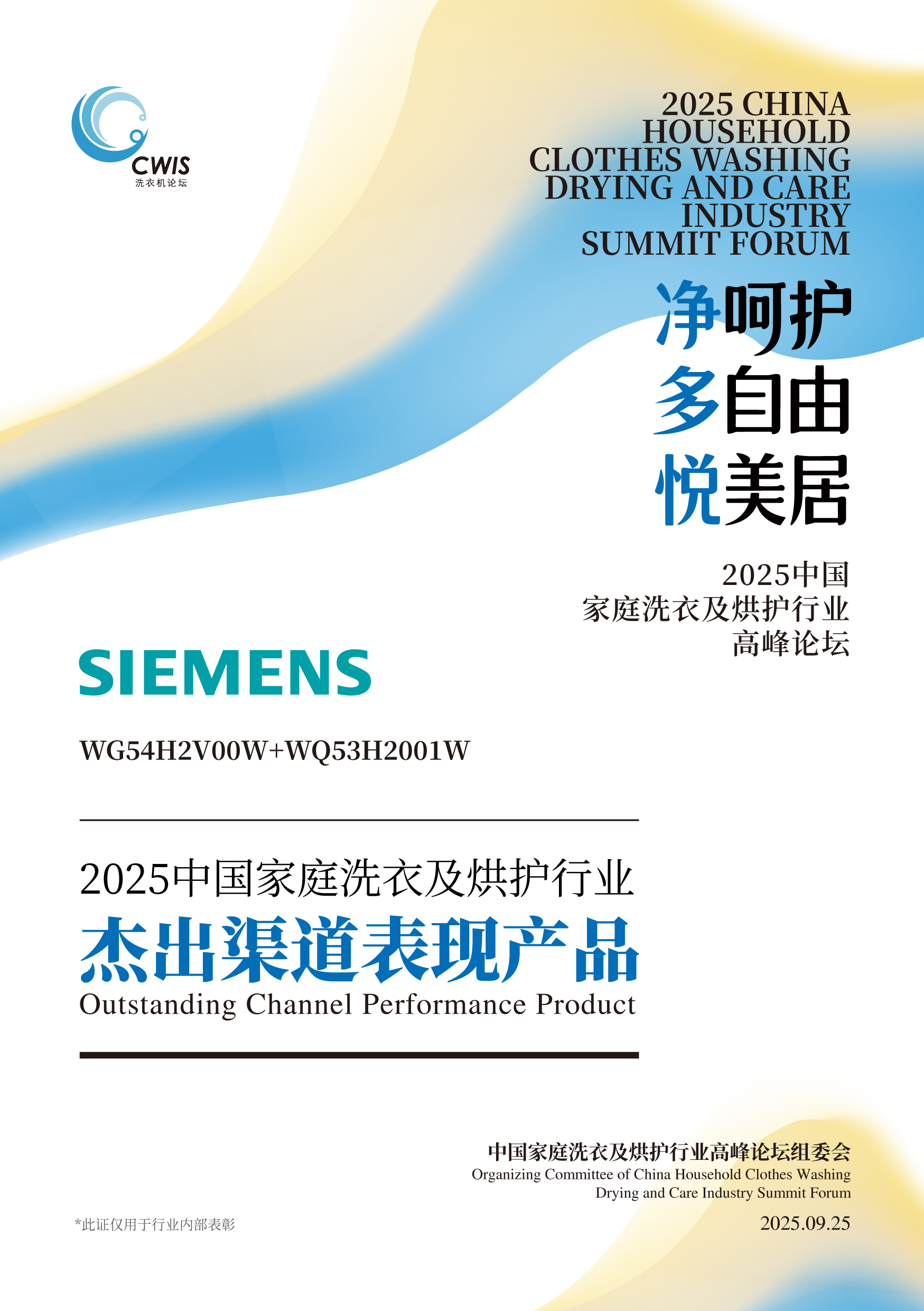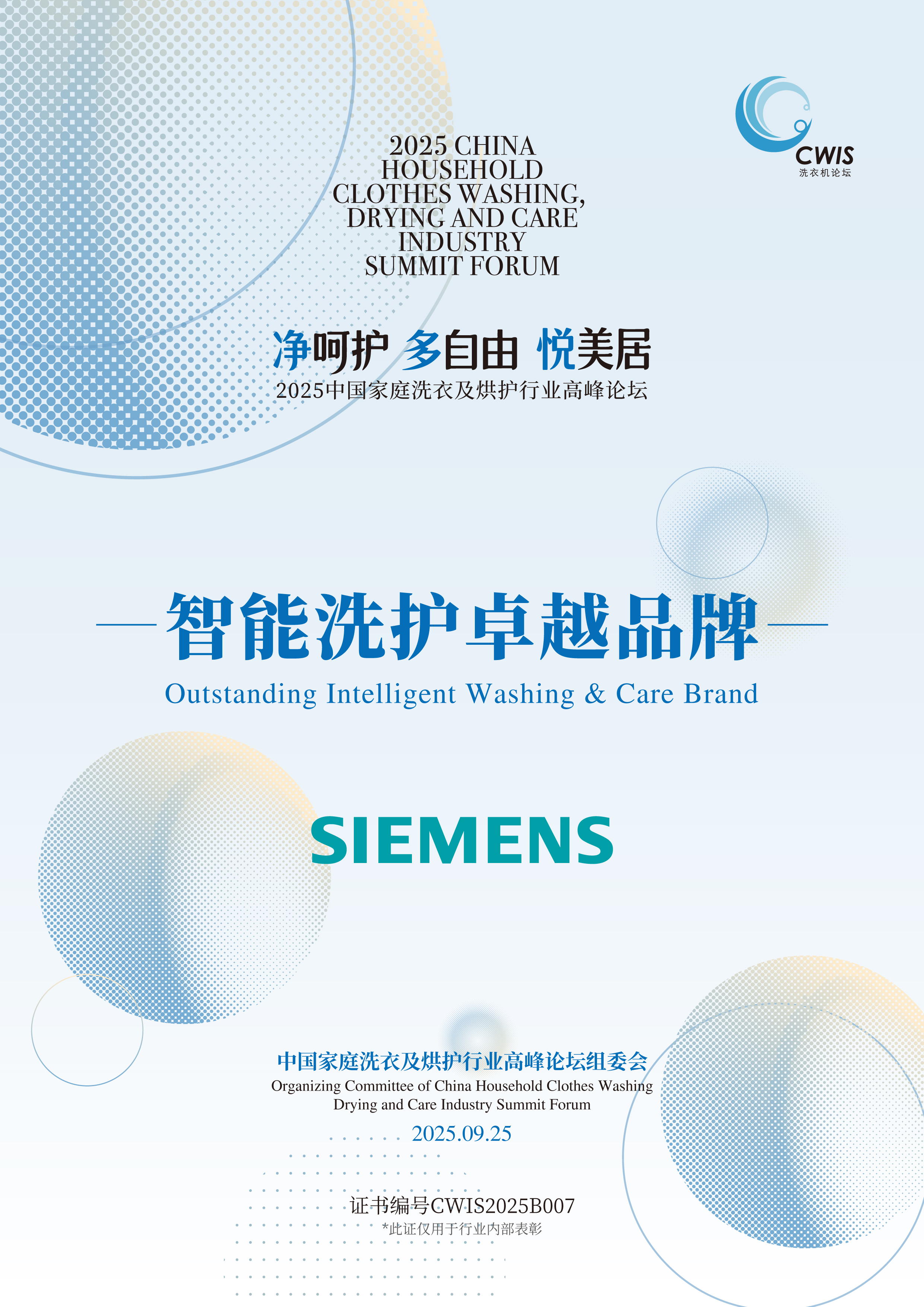 2025年9月25日,由中国家电网主办、中国家用电器协会指导的“2025中国家庭洗衣及烘护行业高峰论坛”在济南隆重举行。本次论坛以“净·呵护多·自由悦·美居”为主题,汇聚行业专家、企业领袖与媒体代表,共同探讨洗护行业发展趋势与技术创新。在备受瞩目的颁奖环节,博西家电旗下品牌西门子家电凭借其在智能洗护领域的卓越表现与创新实力,一举斩获三项殊荣:荣膺“2025中国家庭洗衣及烘护智能洗护卓越品牌”,西门子「包豪斯」洗烘套装获得“2025中国家庭洗衣及烘护高端智能净洗产品”奖,而西门子小晶钻奢护大师洗烘套装则荣获“2025中国家庭洗衣及烘护行业杰出渠道表现产品”奖,此外,博世6系活氧10KG洗烘套装也凭借其优异的市场表现与用户口碑,荣获“2025中国家庭洗衣及烘护行业杰出渠道表现产品”奖,彰显博西家电旗下双品牌协同发力,共同引领高端智能洗护市场的发展潮流。
