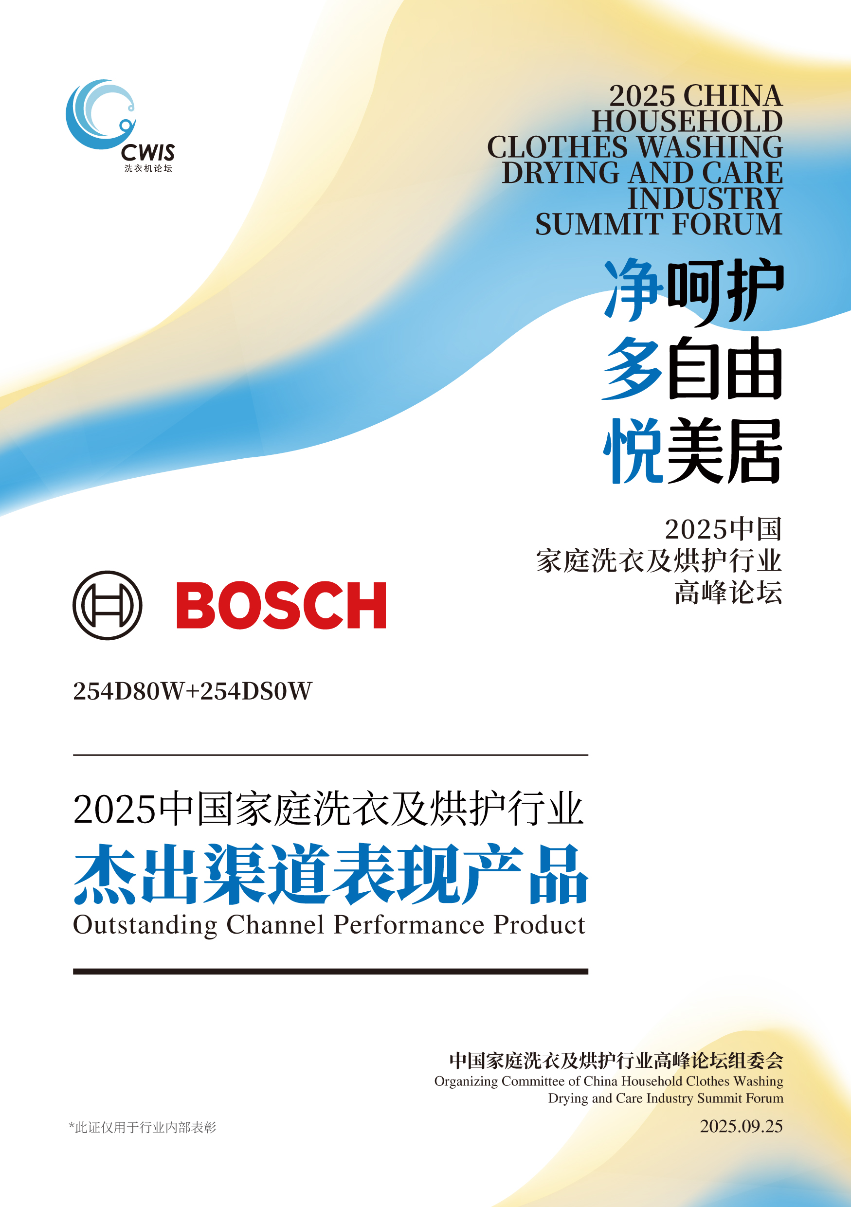 与此同时,博世6系活氧10KG洗烘套装(254D80W+254DS0W)也凭借其卓越的产品力与出色的市场表现,荣获“2025中国家庭洗衣及烘护行业杰出渠道表现产品”奖项。该产品搭载博世标志性健康洗烘科技,采用极简设计语言,外观出众,性能强大,在销售渠道中表现抢眼,成为高端洗护市场的明星产品。其搭载的活氧空气洗,能去除99.99%的病毒,守护家人健康,还能以低温呵护面料,适用于非水洗衣物。活氧洁筒功能可以99.99%除菌1洁净,为衣物提供一个健康的洗涤环境。